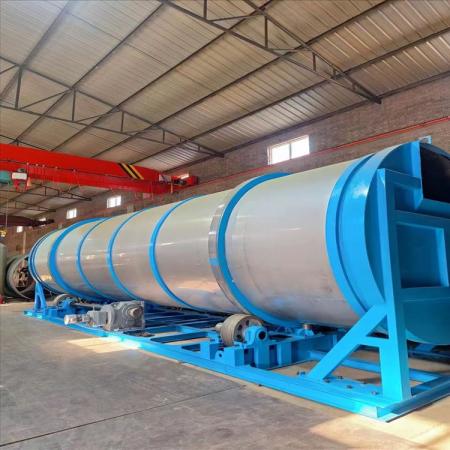 滚筒式污泥好氧分解干化装置,该装置采用复合型的好氧微生物菌将污泥中的有机物进行分解的技术;菌床以木块和木粉为载体,接种复合型的好氧微生物菌,根据菌床体积每天添加一定量的污泥,通过搅拌使污泥和菌床均匀混合;对菌床进行充氧曝气;微生物分解污泥中有机质的过程中产生热量,营造了菌床的高温环境,高温环境中水分蒸发,从而降低污泥中的含水率,并且杀灭污泥中的致病菌和虫卵,实现污泥减量化、无害化,结构简单,易检修,混合效果好,噪音扬尘小。设计进泥指标:设计进泥指标含水率60-80%;出泥指标:污泥好氧分解干化出料含水率30-40%,实现污泥处理处置的无害化、减量化和稳定化目标。好氧干化无需热源,菌群分解有机物自发热,运行温度为55-70℃,最高达到80-90℃。将污泥投入到富含放线菌,丝状菌,油脂降解菌,木质素降解菌等复合型好氧菌的菌床上,混合后生化污泥与微生物接触,被生物分解,其中C、H、O、N 等元素汽化生成H2O、CO2、 N2 ,而P、S、K、N等生成有机肥,是有益于环境的新技术。微生物菌会将有机废弃物90-95%快速有效的分解汽化,余下5%部分可作为生物有机肥使用。比传统处理工艺简单,处理设备少,减少了设备故障率及设备维护成本。含水量在90%以下的污泥都可直接投入,无需添加外界辅料调节水分。岀料时进行筛分,大块部分回到菌床,筛下物作为土壤改良剂用于农业返田。通过菌床来调节水分。可减少污泥调理剂的使用,降低泥水分离成本,减少污泥中添加有害化学成分。