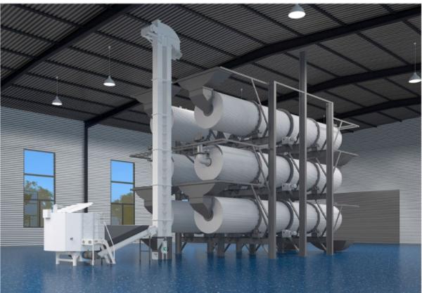 原材料秸秆、剩菜烂叶、动物粪便、稻壳、菌棒、甘蔗渣等通过一体机称重显示配比,进行揉切、搅拌、高温杀菌,加入发酵菌种及辅料,完成后出仓经双桶搅拢输送至物料提升机,进入顶层发酵罐, 3天后自动进中间发酵