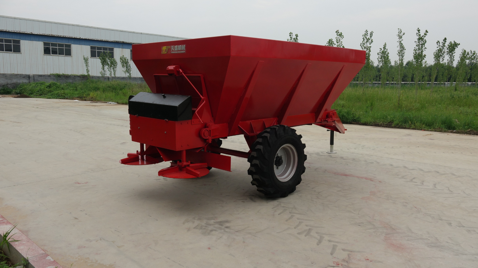 该机结构紧凑,保养简单,维护成本低;撒布均匀,作业效率高,适用环境广泛。通过三角带驱动的两个旋转盘实现撒布作业,再每个圆盘上有四个固定可调的播齿,此结构除了可以提高撒布的均匀性外,简单地改变播齿的角度,还可以改变撒布范围,由拖拉机变速箱后输出提供动力。