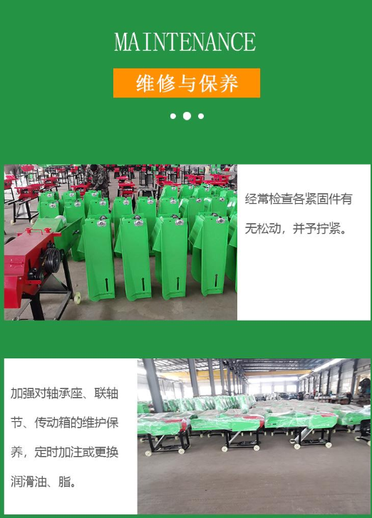 3、安装皮带前,应先检查牵引动力的旋转方向是否和铡草机铡切方向一致,确定无误后在调整安装皮带,并使其皮带松紧适当。