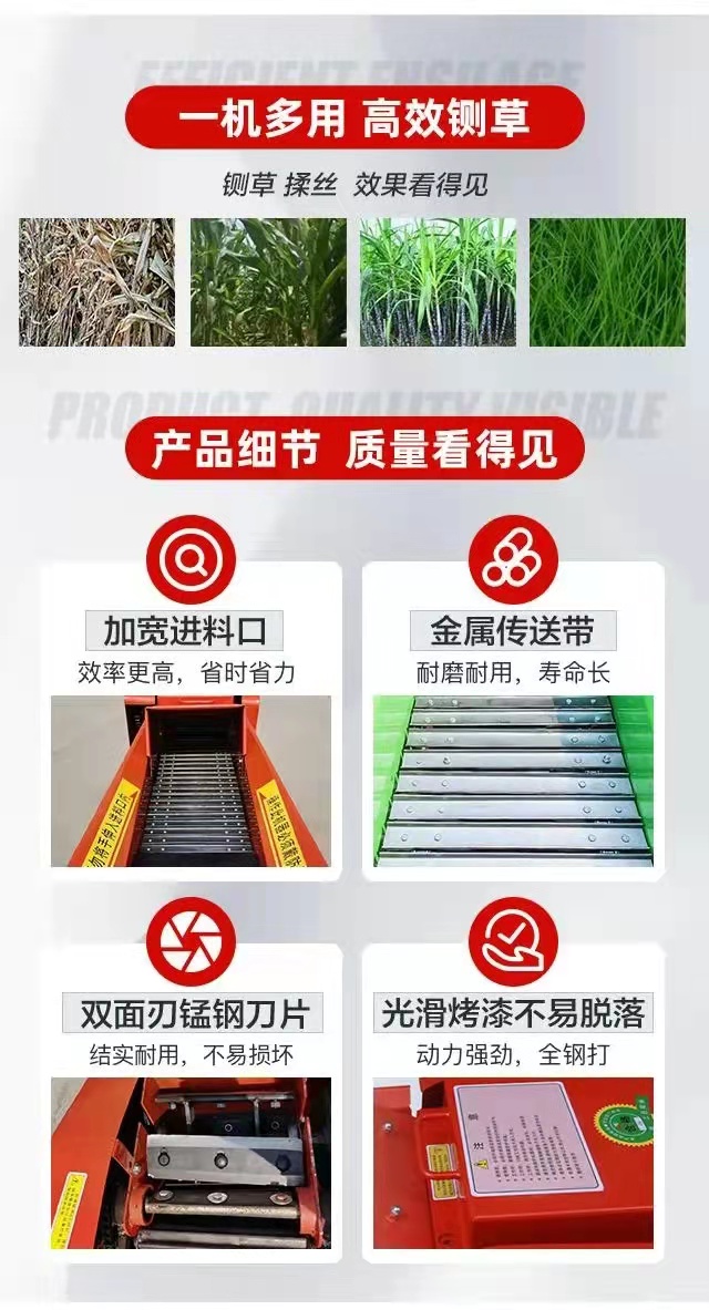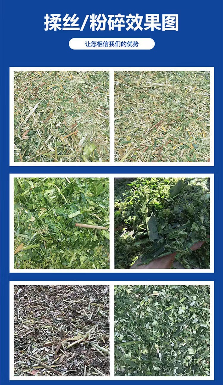 铡草机适用范围: 用于铡切青、干玉米秸秆、棉秆、牧草、稻草、麦秸等农作物秸秆和直径5cm以下的树枝。加工的物料适用于养殖牛、羊、鹿、马等多功能铡草粉碎揉搓机是及铡草,粉碎,揉搓为一体的新型草秸类加工机。揉搓能使玉米秸、豆秸、麦秸等农作物及野生杂草变成较柔软的丝状饲料,供牛、羊采食,也可配合颗粒饲料机和压块机压制成颗粒块状便于储存运输。可单独做铡草机、粉碎和打浆机使用